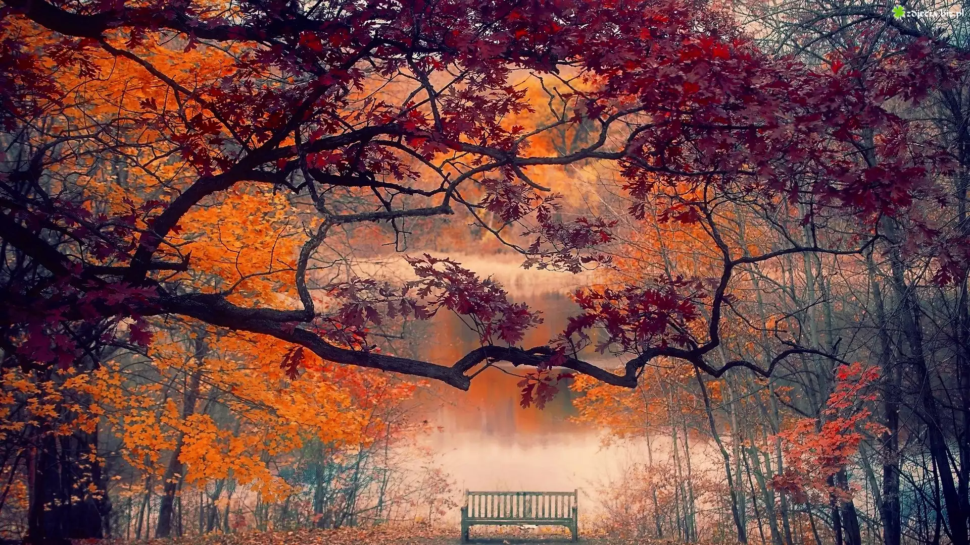 Zdjęcie, Park, Mgła, Staw, Drzewa, Ławka