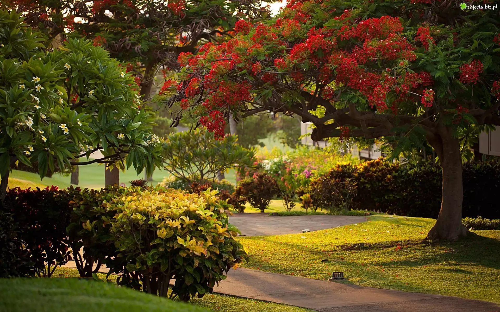 Zdjęcie Park, Alejka, Kwitnące, Drzewo, Krzewy