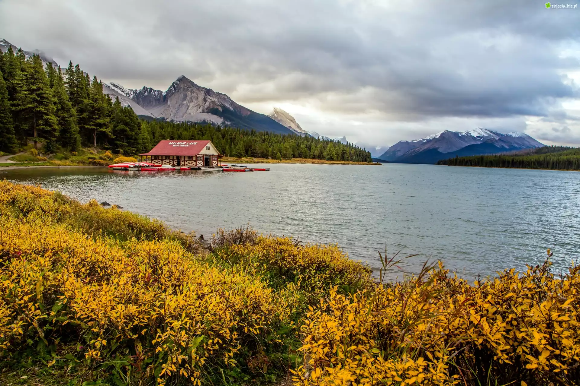Zdjęcie Kanada, Park Narodowy Jasper, Prowincja Alberta, Jezioro Maligne, Góry, Lasy, Przystań, Łódki, Jesień |