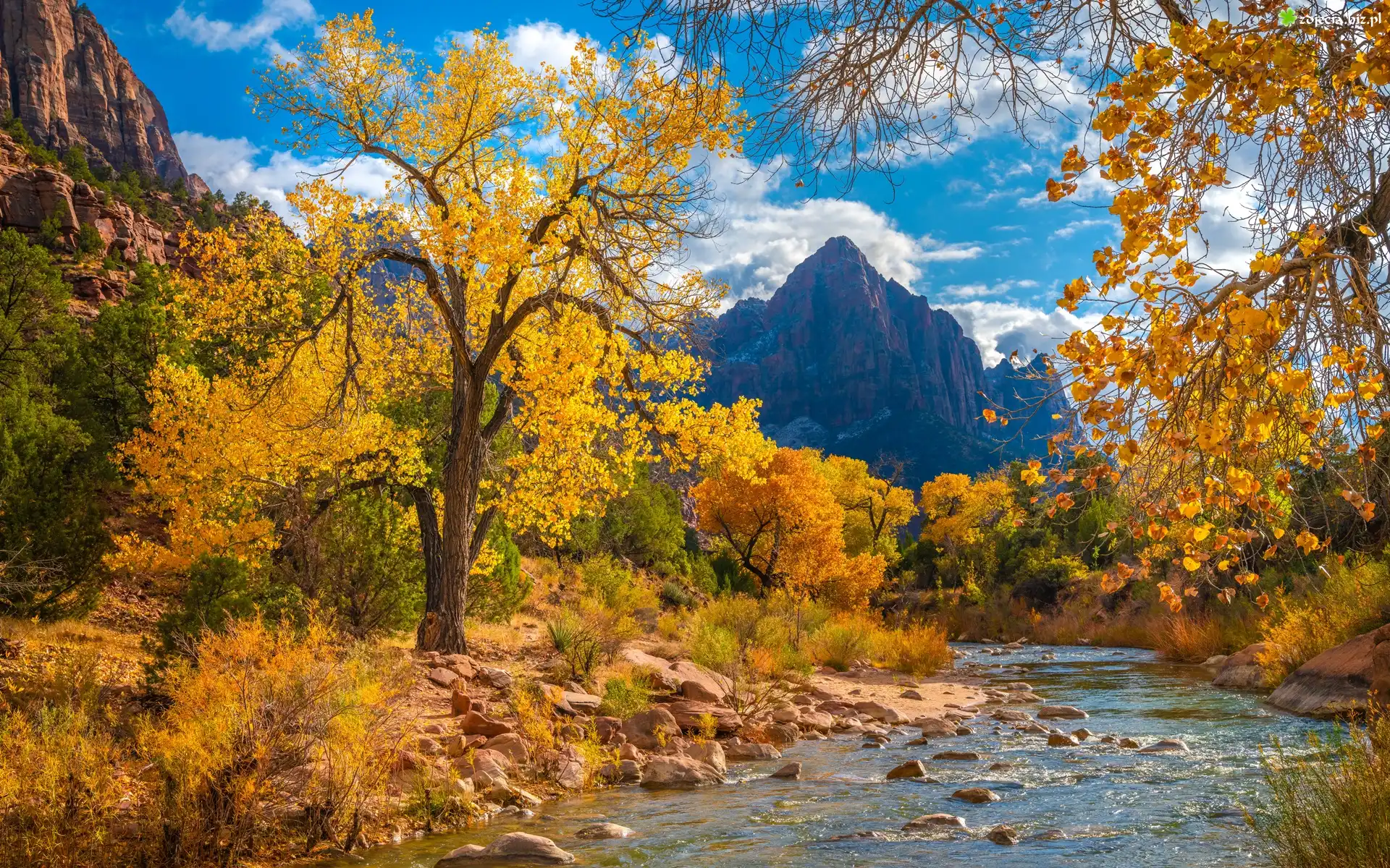 Zdjęcie Park Narodowy Zion, Góry, Góra Watchman, Rzeka Virgin River, Kamienie, Drzewa, Jesień, Chmury, Stan Utah, Stany Zjednoczone |