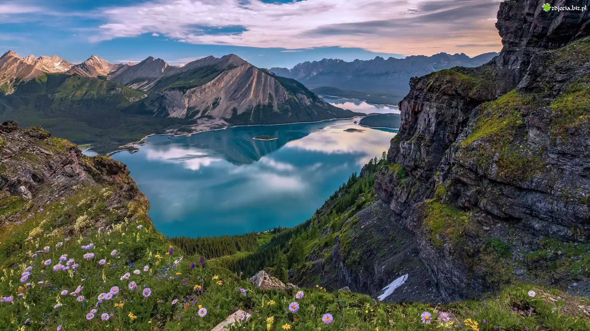 Zdjęcie Kanada, Jezioro Upper Kananaskis Lake, Park Prowincjonalny Petera Lougheeda, Kwiaty, Góry, Chmury |