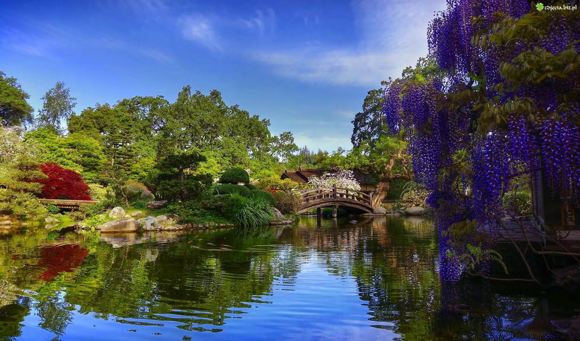 Zdjęcie Park, Staw, Mostek, Krzewy, Drzewa