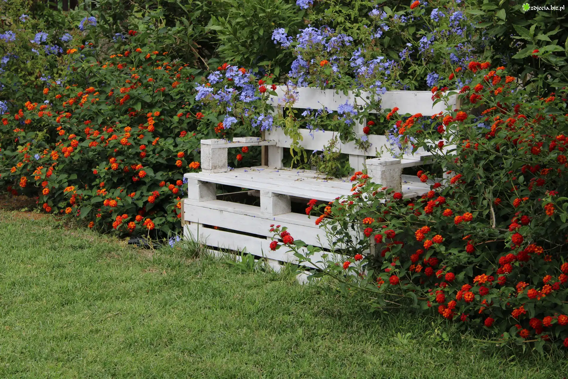 Zdjęcie Park, Ławka, Kwiaty, Trawa