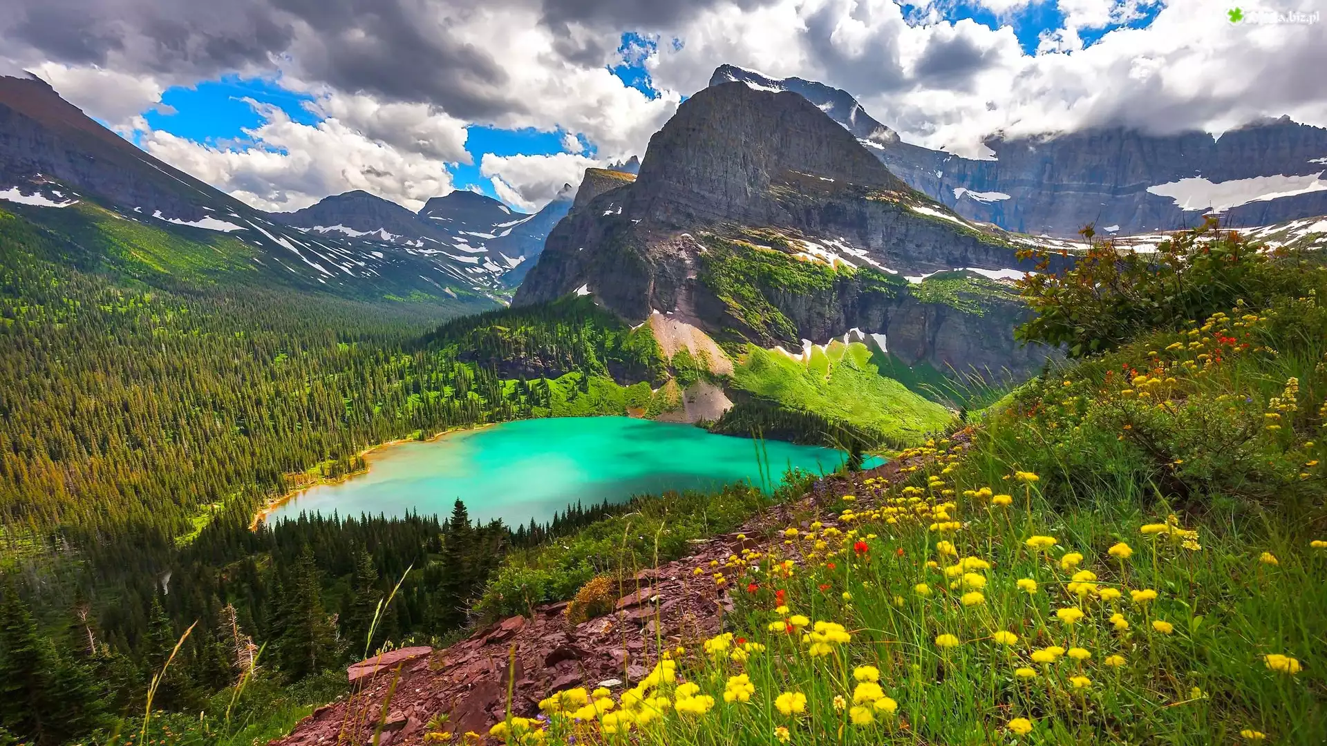 Zdjęcie Góry, Jezioro, Grinnell Lake, Kwiaty, Drzewa, Las, Chmury, Park Narodowy Glacier, Montana, Stany Zjednoczone |
