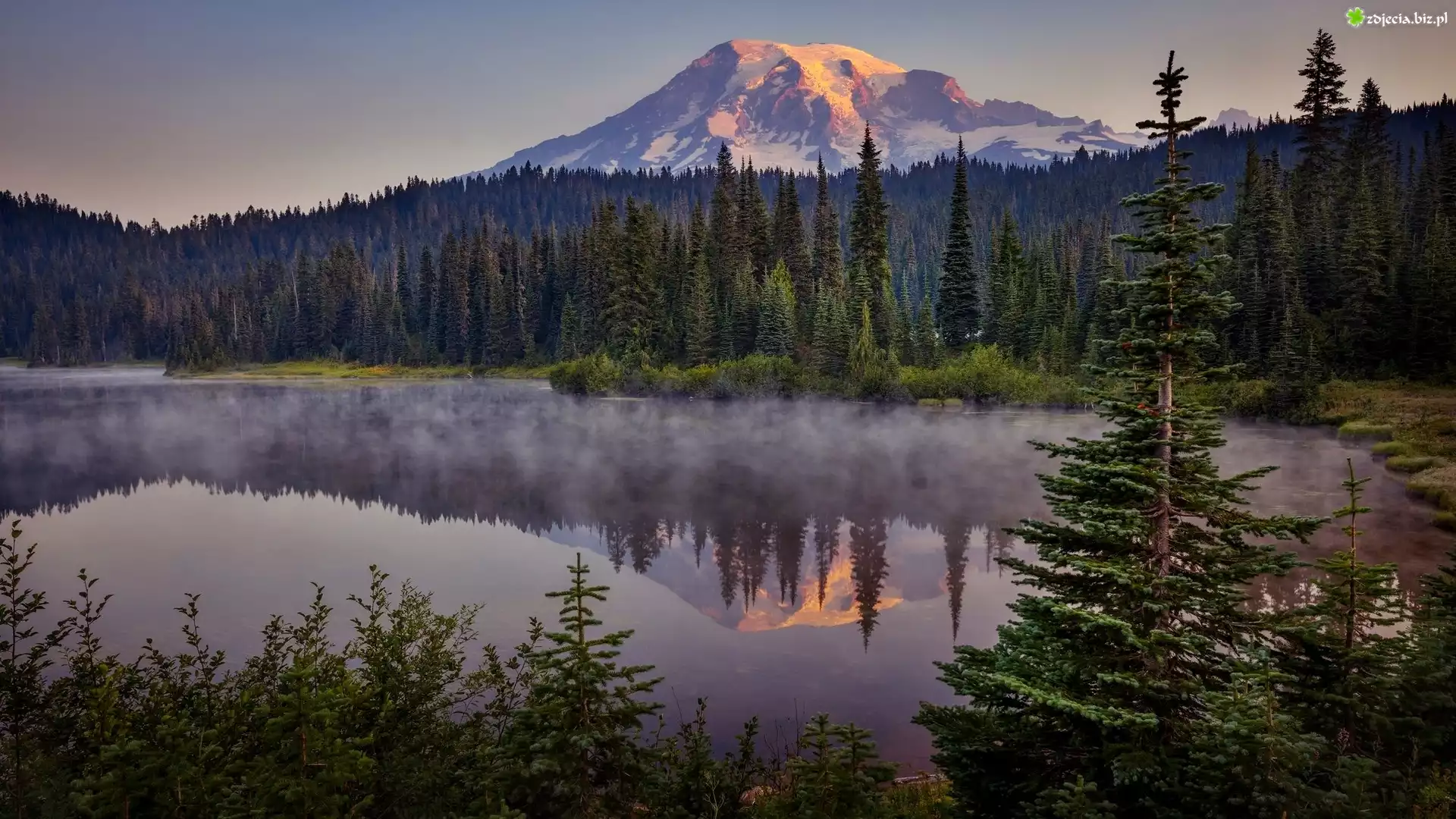 Zdjęcie Park Narodowy Mount Rainier, Jezioro Reflection Lakes, Góra, Szczyt Mount Rainier, Stan Waszyngton, Stany Zjednoczone, Las, Drzewa, Świerki, Mgła |