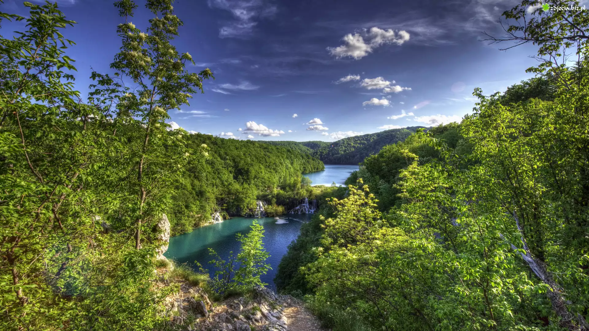 Zdjęcie, Park Narodowy Jezior Plitwickich, Wodospady, Jeziora, Zielone, Drzewa, Lasy, Chorwacja
