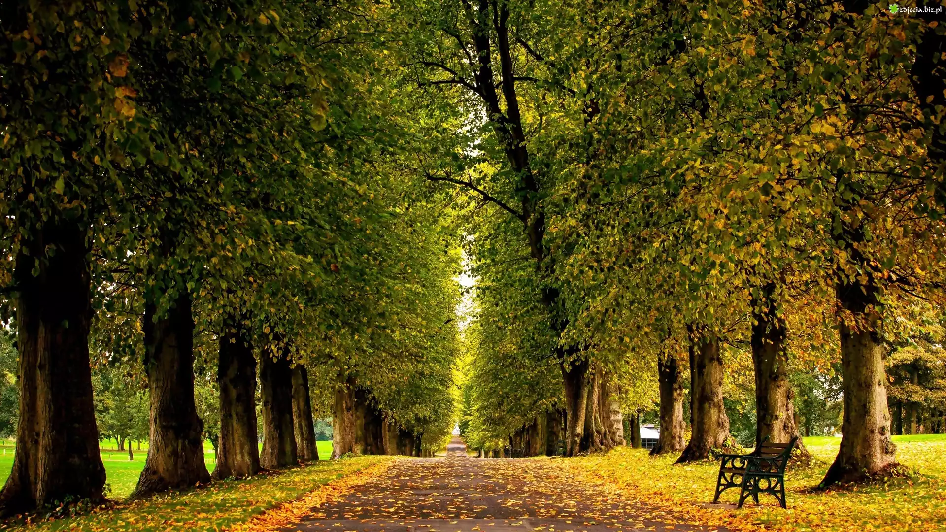 Zdjęcie Park, Droga, Ławki, Drzewa, Liście, Jesień
