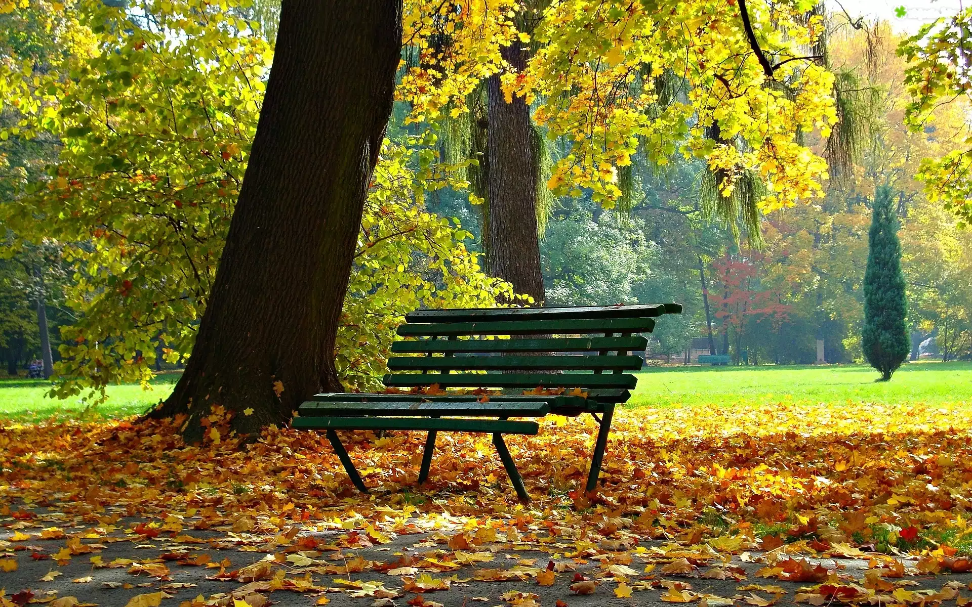 Zdjęcie Park, Ławka, Drzewa, Opadłe, Liście, Jesień