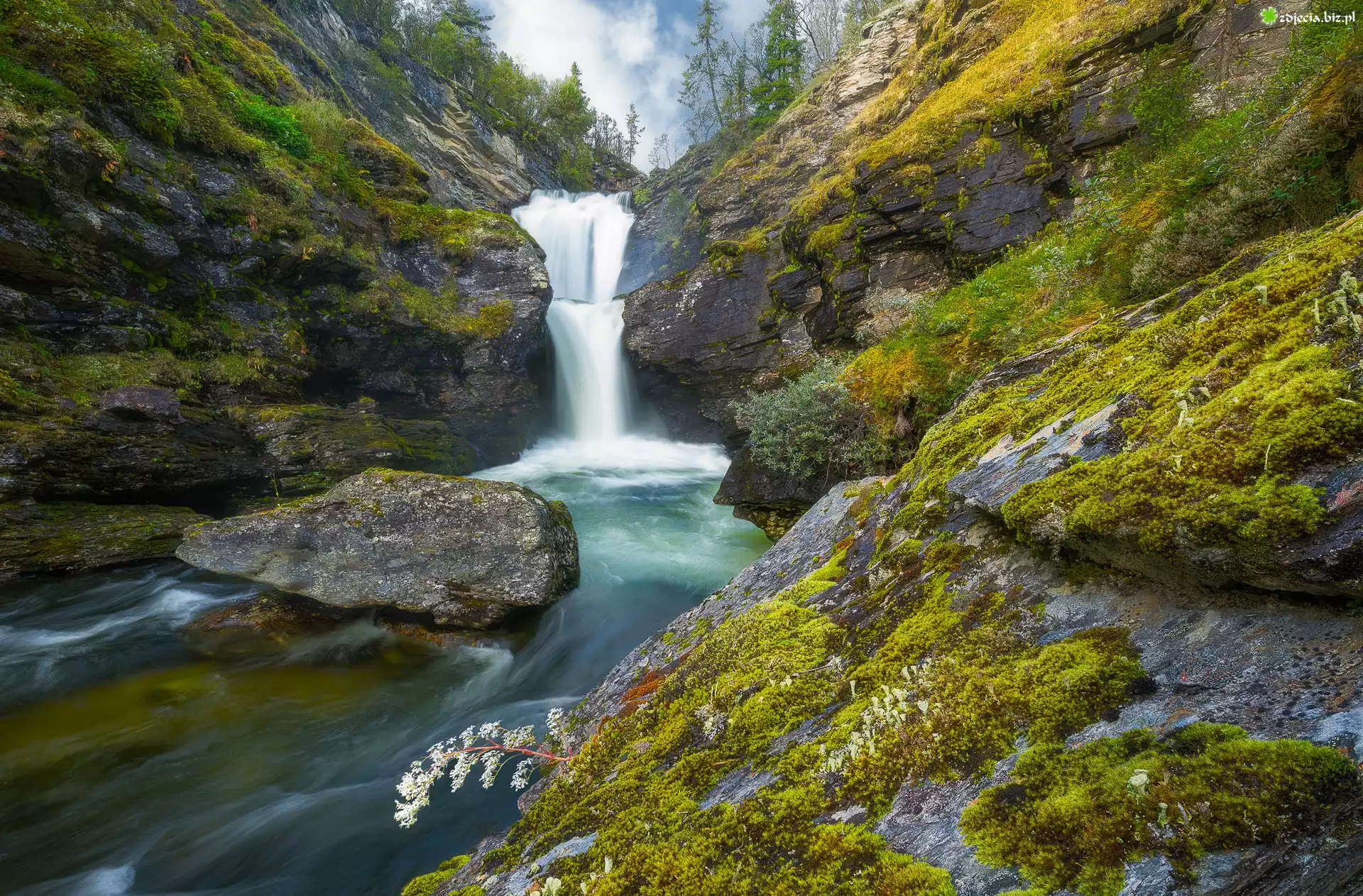Zdjęcie, Norwegia, Park Narodowy Rondane, Wodospad, Skały, Mech