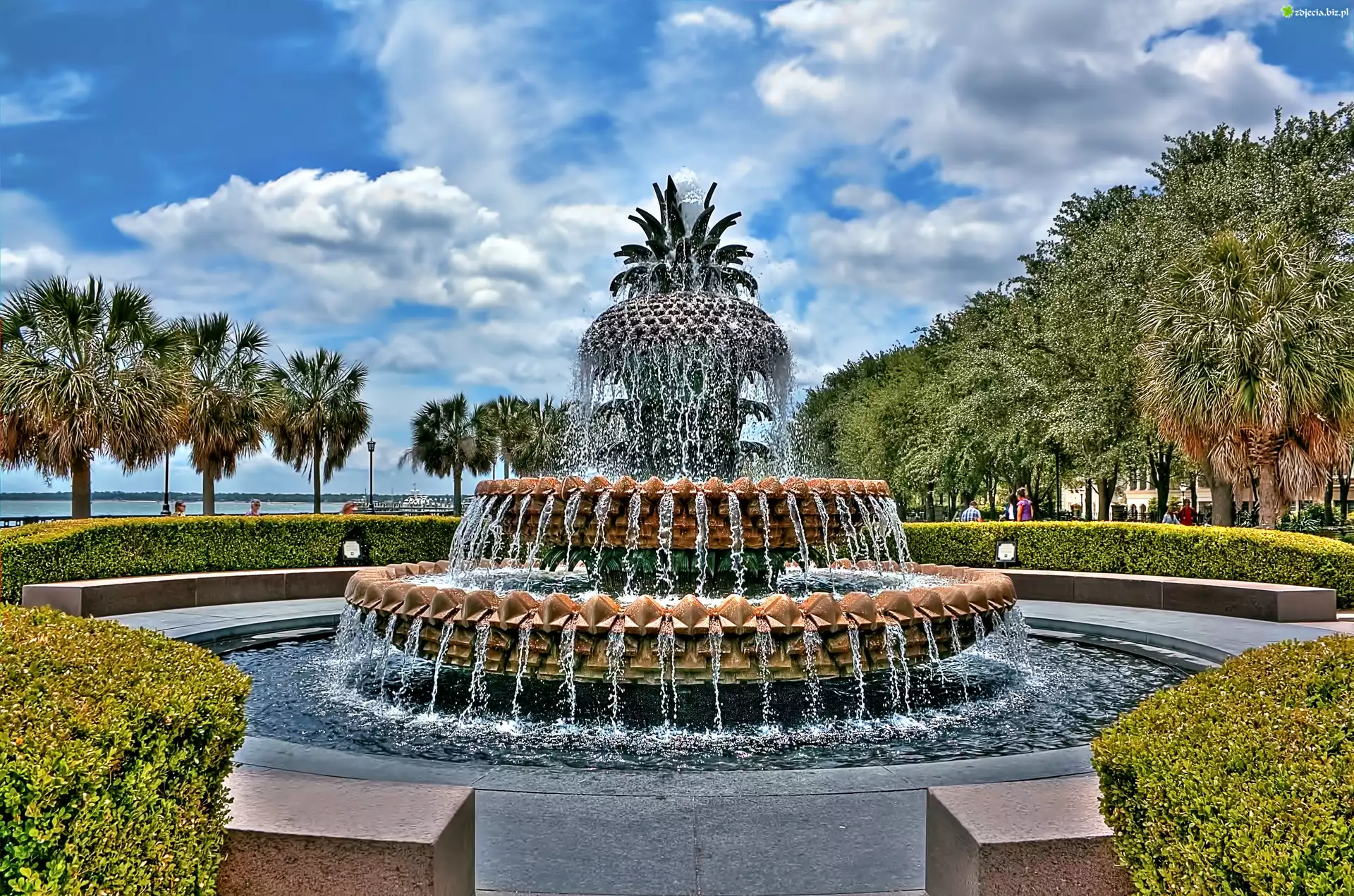 Zdjęcie Park, Fontanna, Palmy, Obłoki, HDR