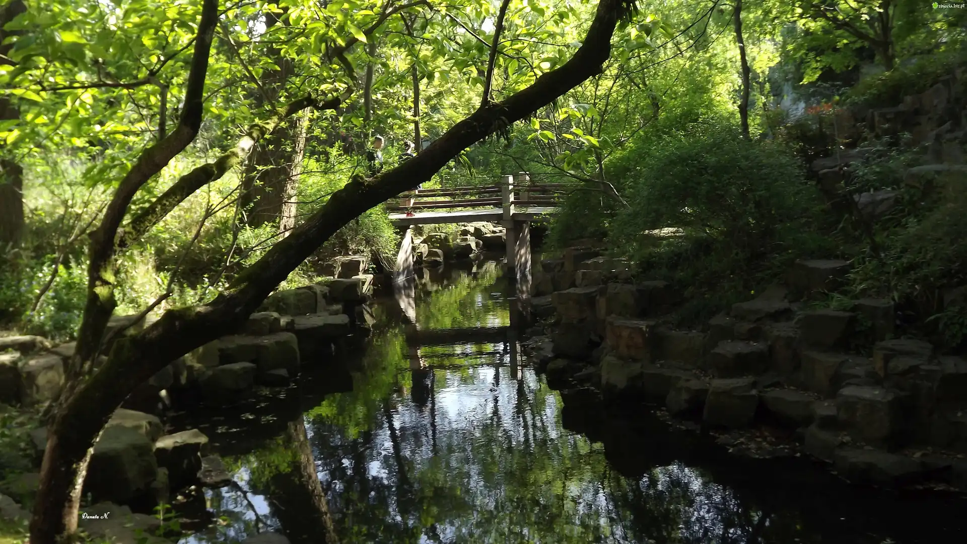 Zdjęcie, Ogród, Park, Styl, Chiński, Most, Drzewa, Kamienie