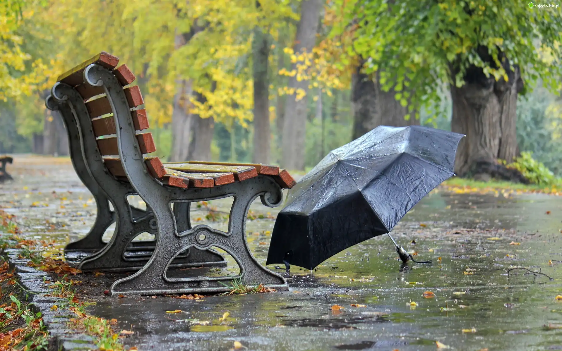 Zdjęcie Park, Ławka, Parasol, Jesień, Deszcz
