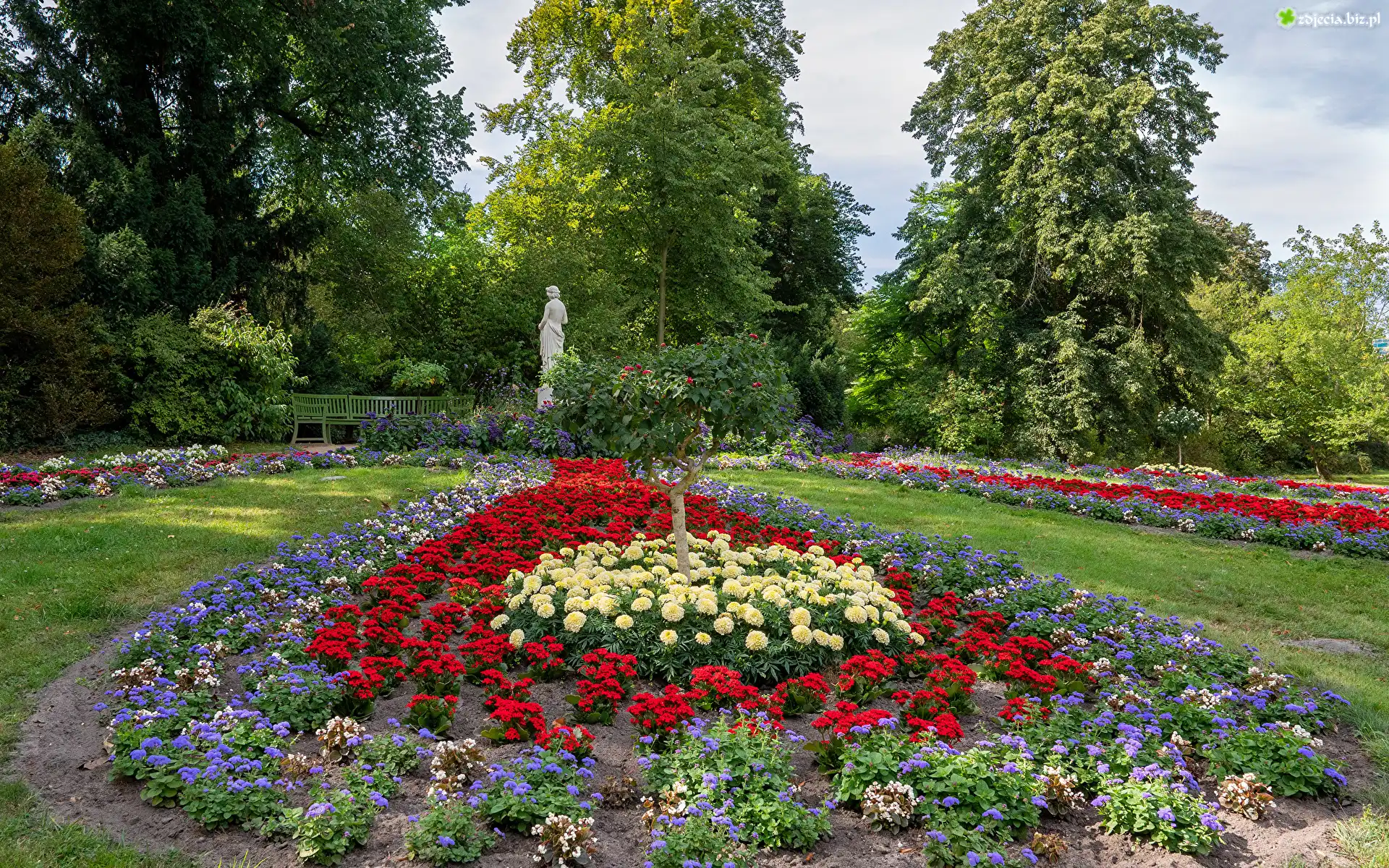 Zdjęcie Park, Kwiaty, Drzewa, Rabaty, Posąg, Ławki