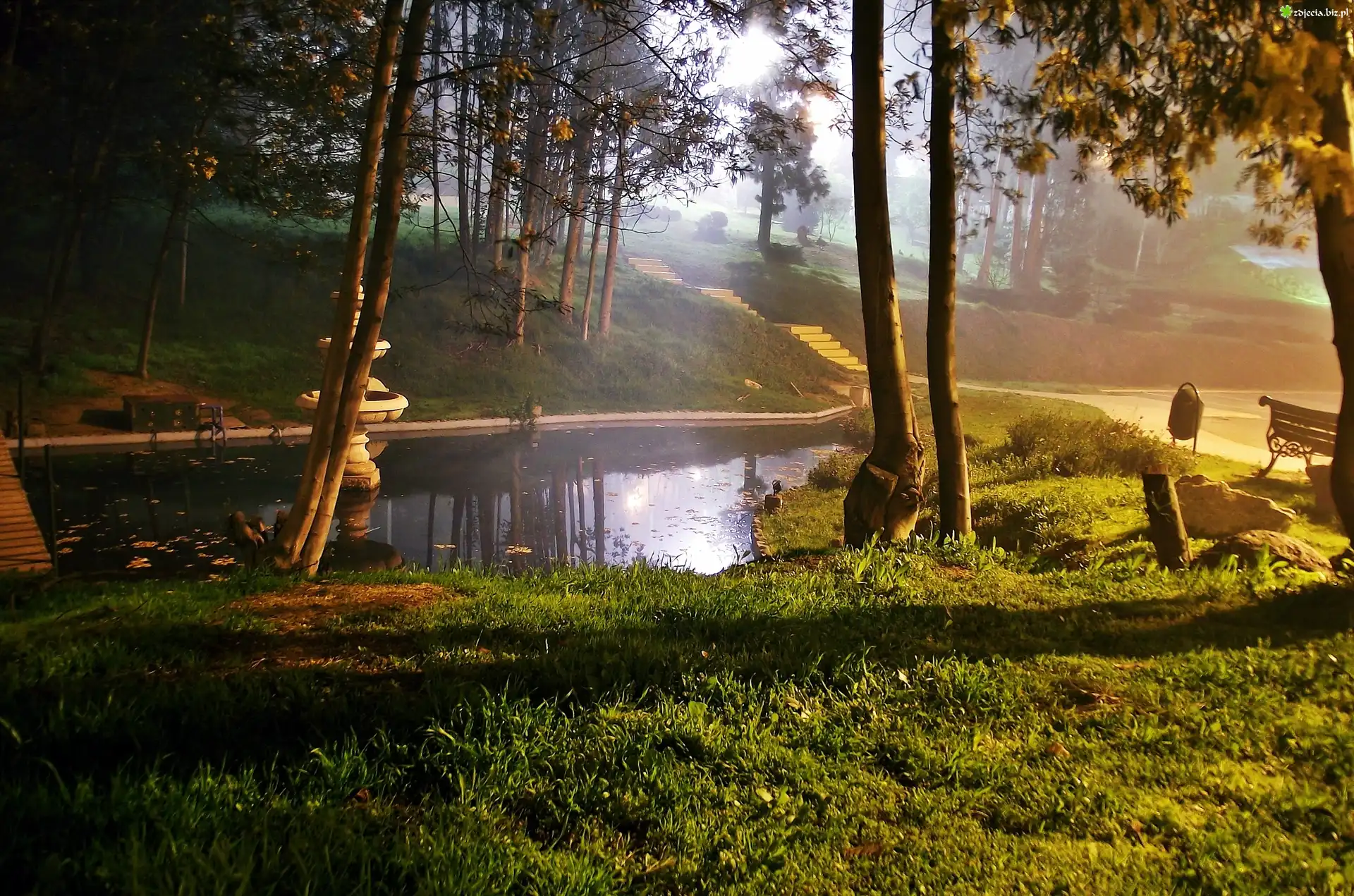 Zdjęcie Park, Staw, Fontanna, Przebijające, Światło
