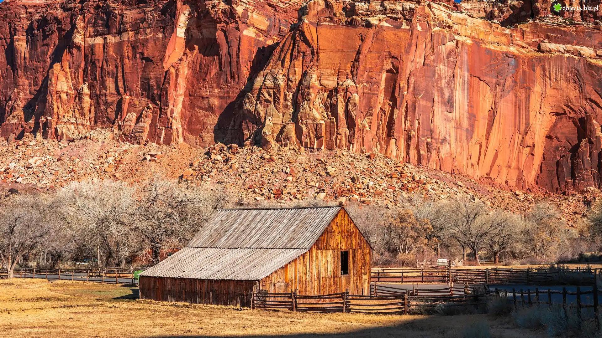 Zdjęcie Park Narodowy Capitol Reef, Stan Utah, Stany Zjednoczone, Skały, Drzewa, Drewniany, Dom, Ogrodzenie |