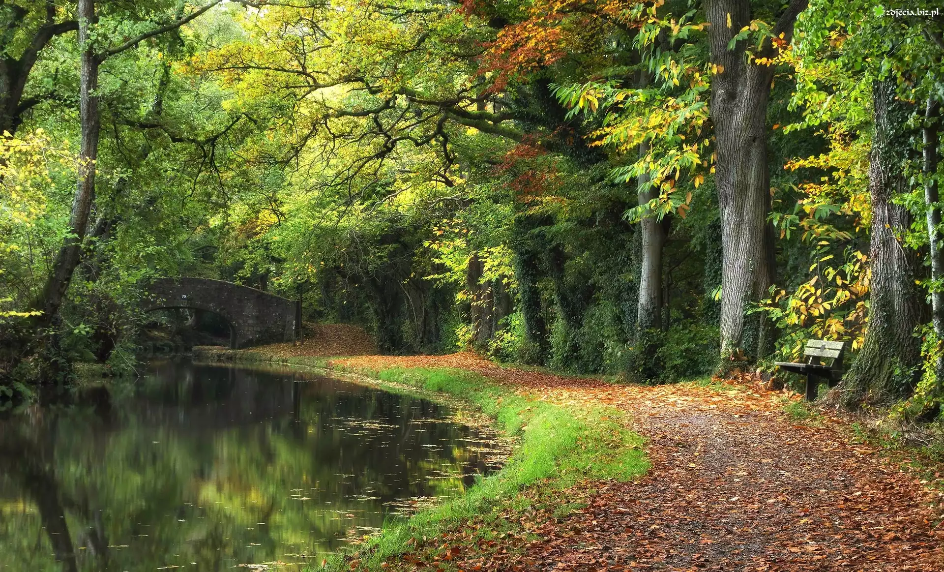 Zdjęcie Park, Drzewa, Aleja, Ławka, Rzeka, Most