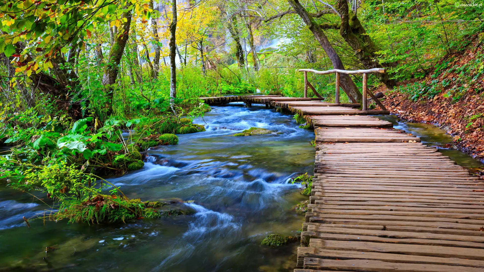 Zdjęcie, Chorwacja, Park Narodowy Jezior Plitwickich, Las, Pomost, Rzeka