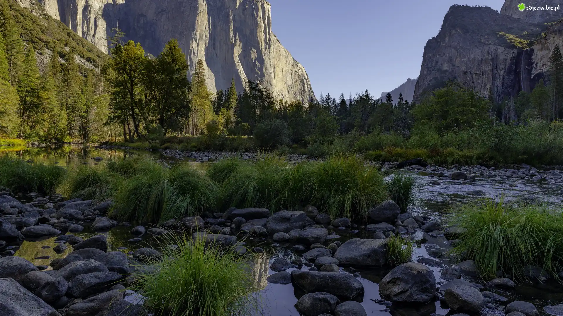 Zdjęcie Park Narodowy Yosemite, Góry Sierra Nevada, Rzeka, Merced River, Dolina, Yosemite Valley, Kępki, Trawy, Kamienie, Drzewa, Kalifornia, Stany Zjednoczone |