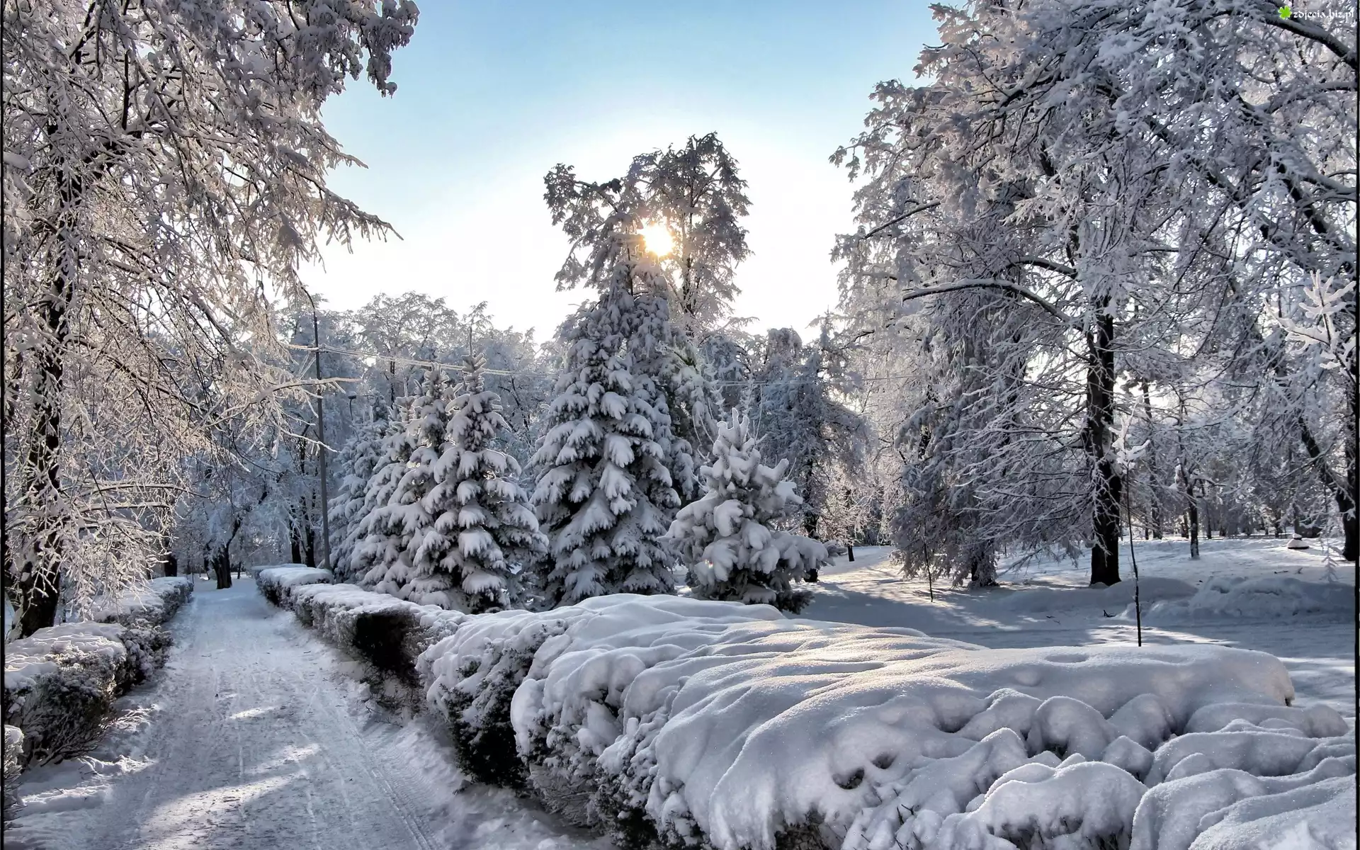 Zdjęcie Park, Alejki, Drzewa, Promienie, Słońca, Zima