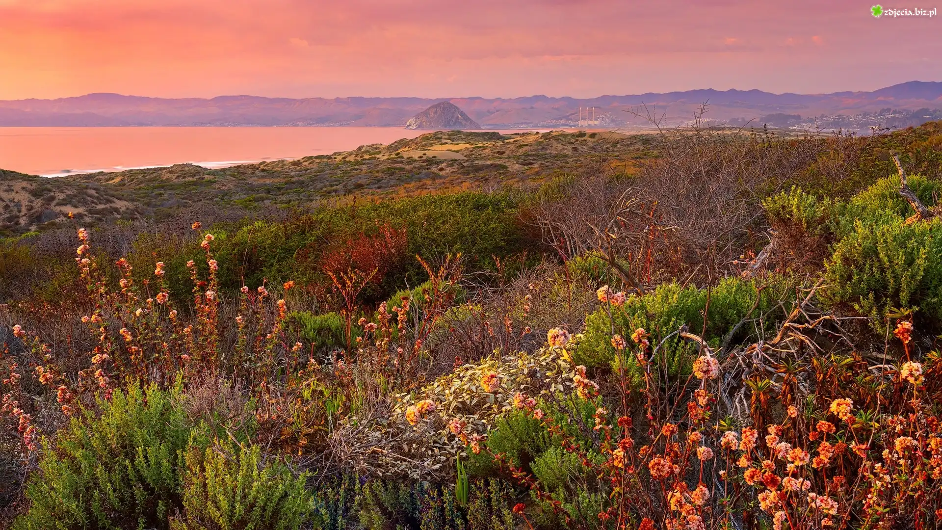 Zdjęcie Stany Zjednoczone, Kalifornia, Park Stanowy Montana de Oro, Zachód słońca, Wzgórza, Krzewy, Roślinność |