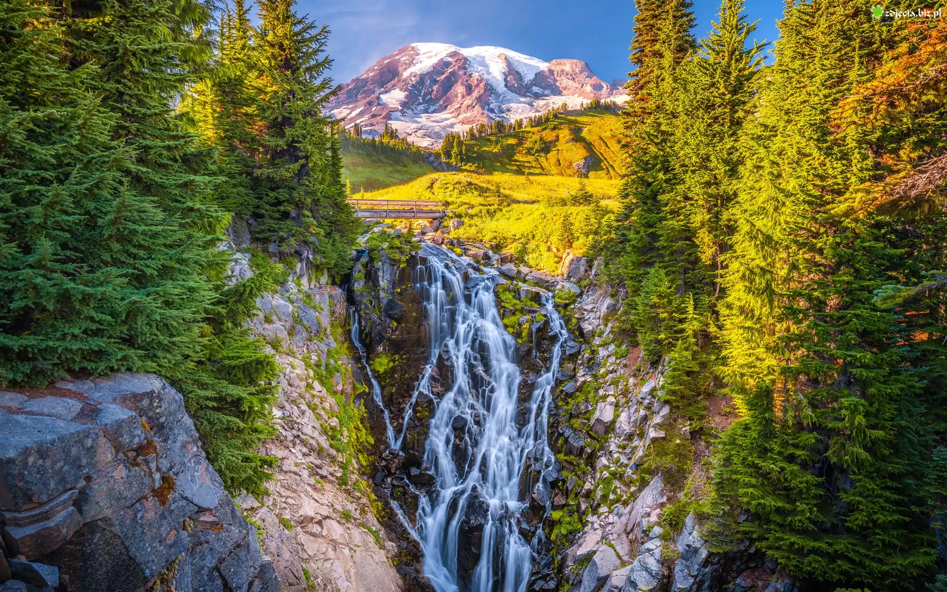 Zdjęcie Park Narodowy Mount Rainier, Góry, Stratowulkan Mount Rainier, Wodospad, Myrtle Falls, Drzewa, Stan Waszyngton, Stany Zjednoczone |