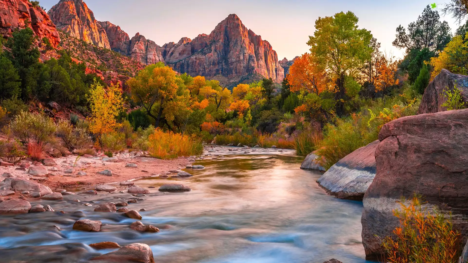 Zdjęcie Park Narodowy Zion, Góry Watchman, Rzeka, Virgin River, Kamienie, Drzewa, Jesień, Stan Utah, Stany Zjednoczone |
