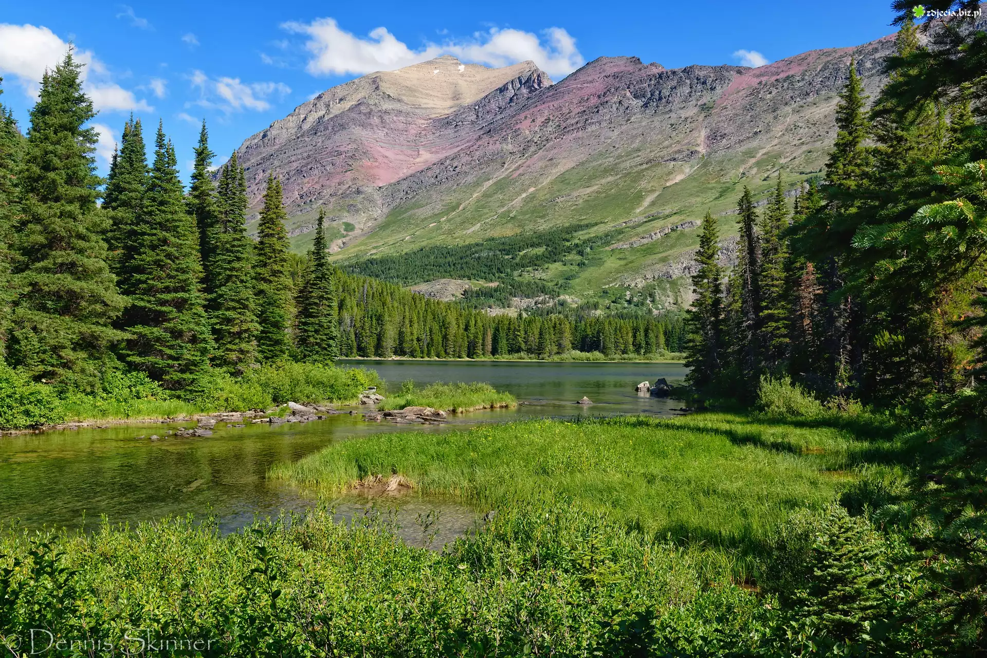 Zdjęcie Stany Zjednoczone, Montana, Park Narodowy Glacier, Góry Skaliste, Jezioro, Swiftcurrent Lake, Drzewa, Trawa |