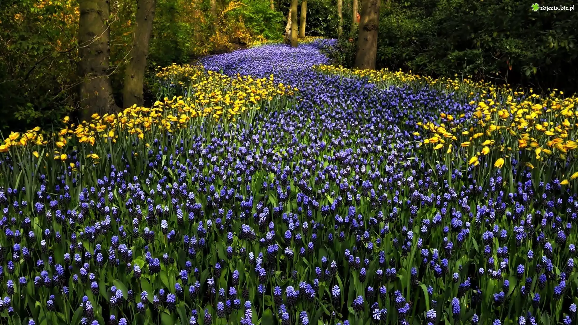Zdjęcie Park, Drzewa, Kwiaty, Szafirki, Tulipany
