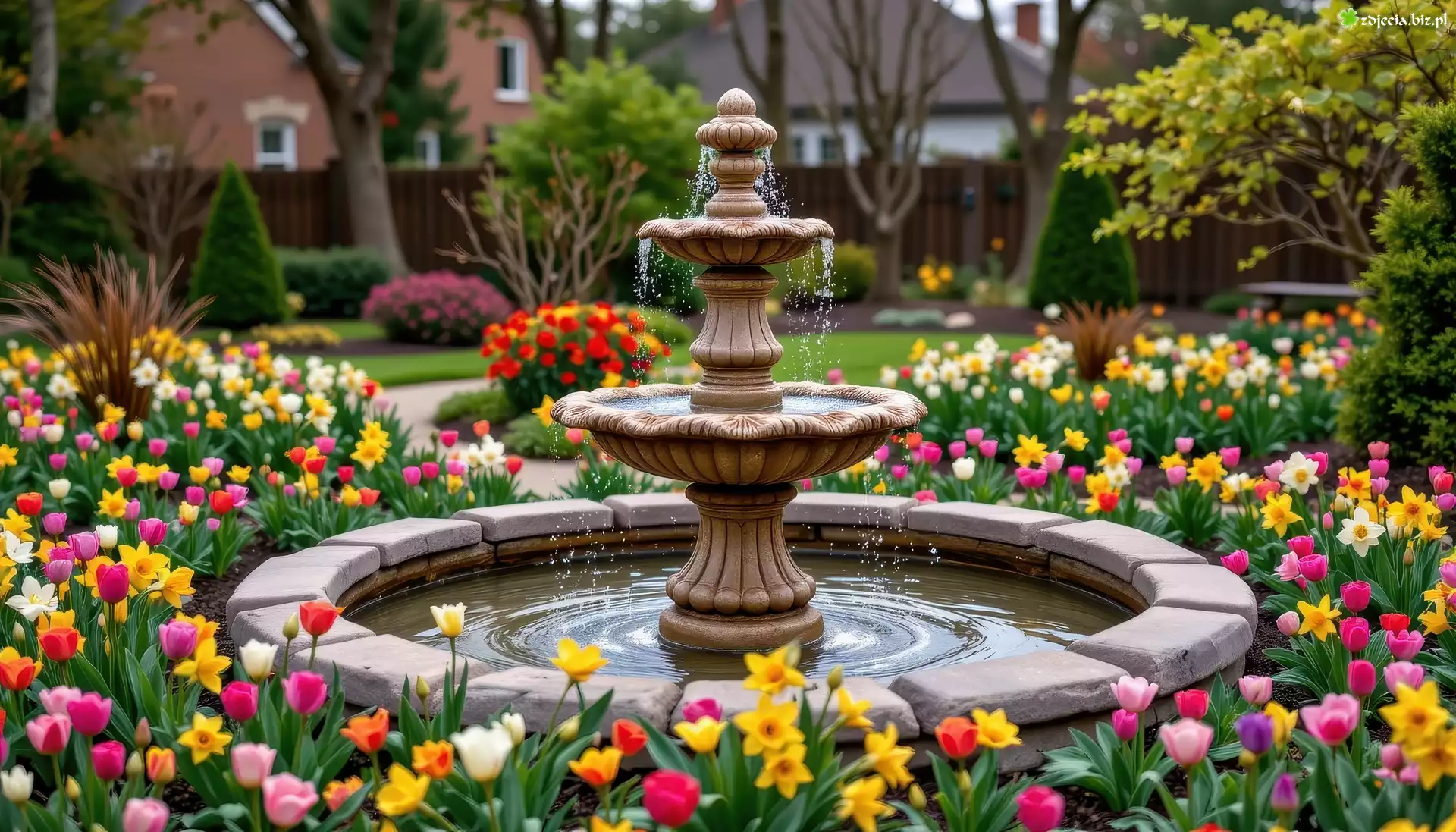 Zdjęcie Park, Kamienna, Fontanna, Kolorowe, Kwiaty, Tulipany, Żonkile, Drzewa, Wiosna, AI