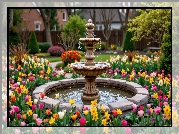 Zdjęcie, Park, Kamienna, Fontanna, Kolorowe, Kwiaty, Tulipany, Żonkile, Drzewa, Wiosna, AI