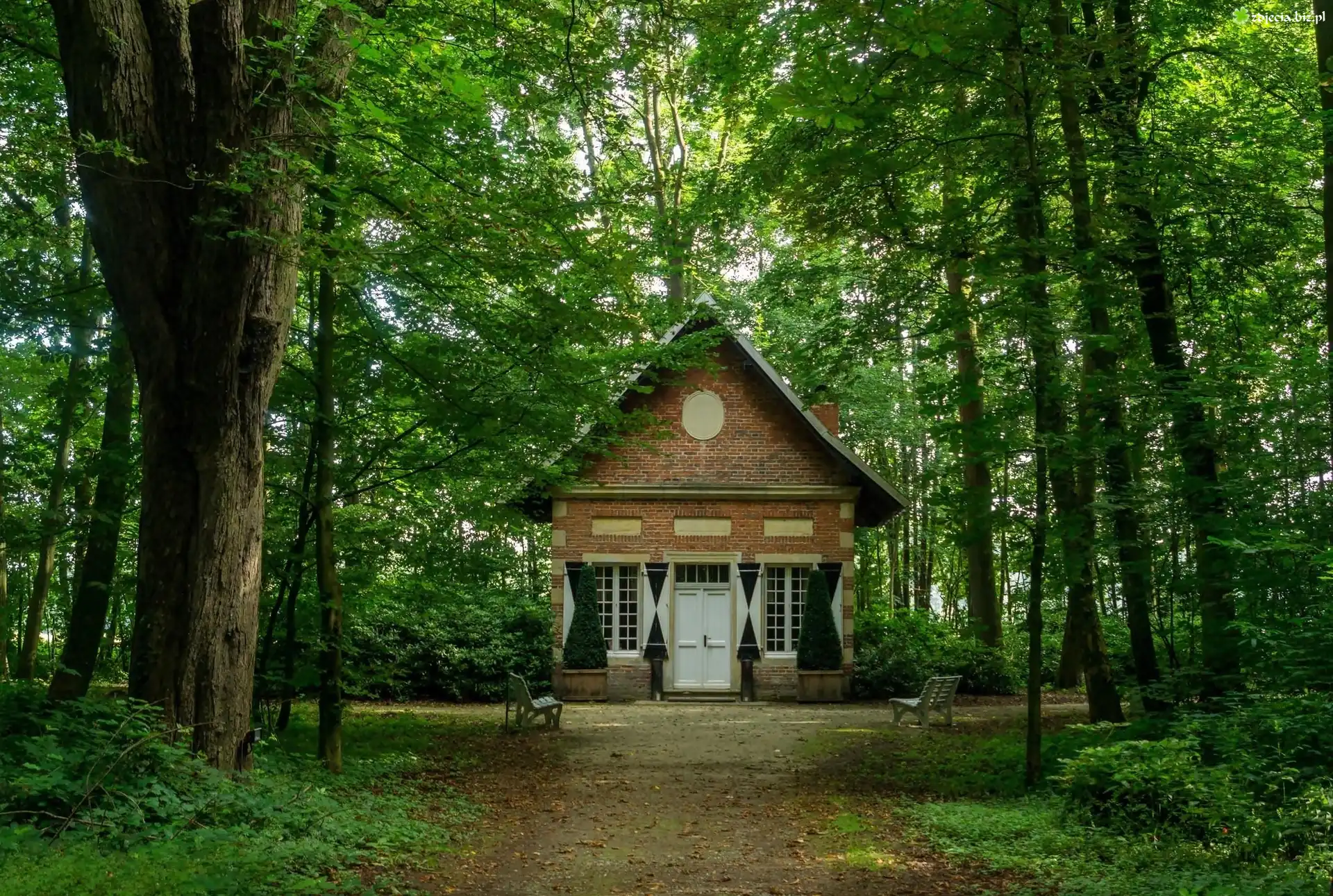 Zdjęcie, Park, Domek, Alejki, Ławki, Zielone, Drzewa