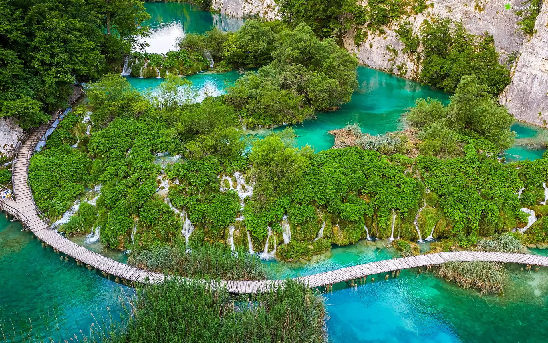 Zdjęcie, Park Narodowy Jezior Plitwickich, Jeziora, Wodospady, Zielone, Drzewa, Chorwacja