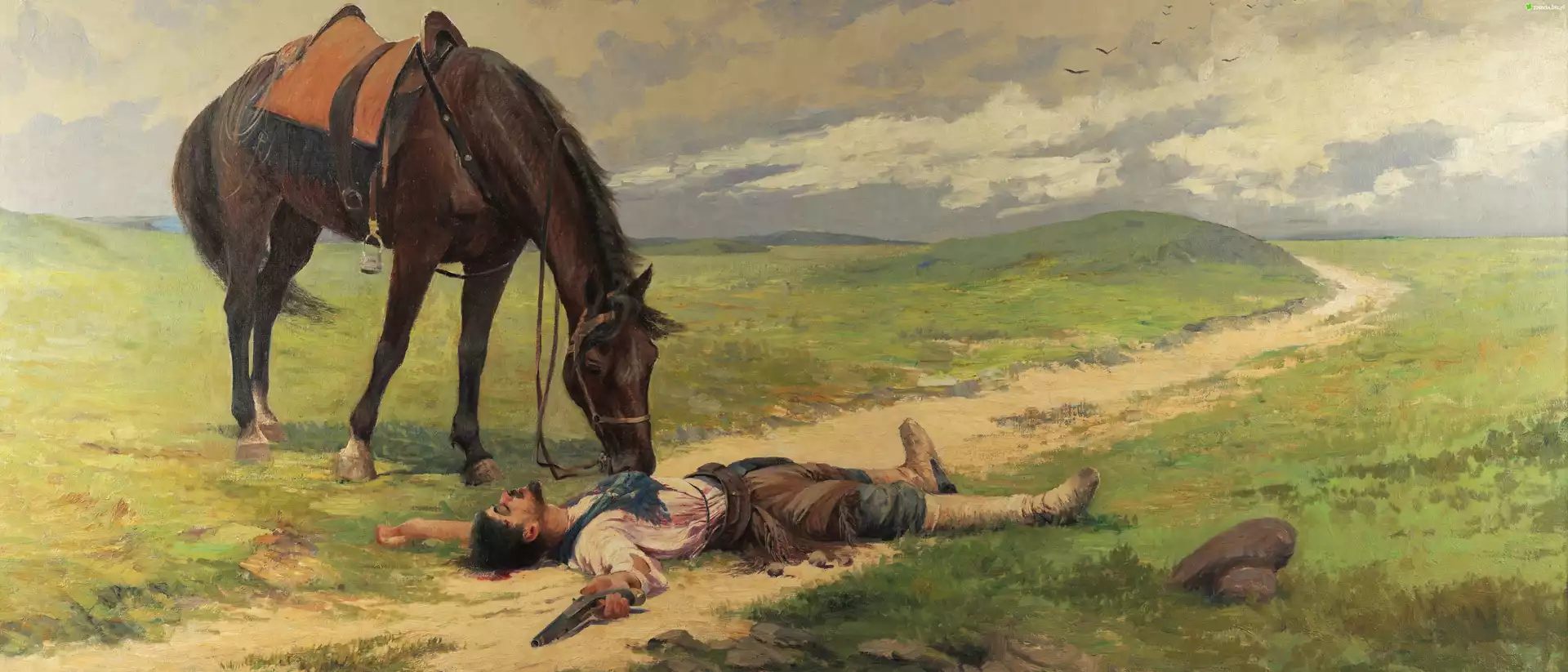 Zdjęcie Malarstwo, Obraz, Antonio Parreiras, Fim de romance, Koniec romansu, Koń, Mężczyzna, Broń, Samobójstwo |