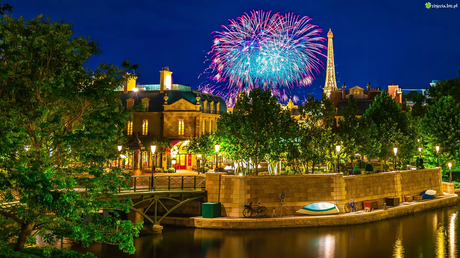 Zdjęcie Francja, Paryż, Wieża Eiffla, Rzeka, Most, Fajerwerki