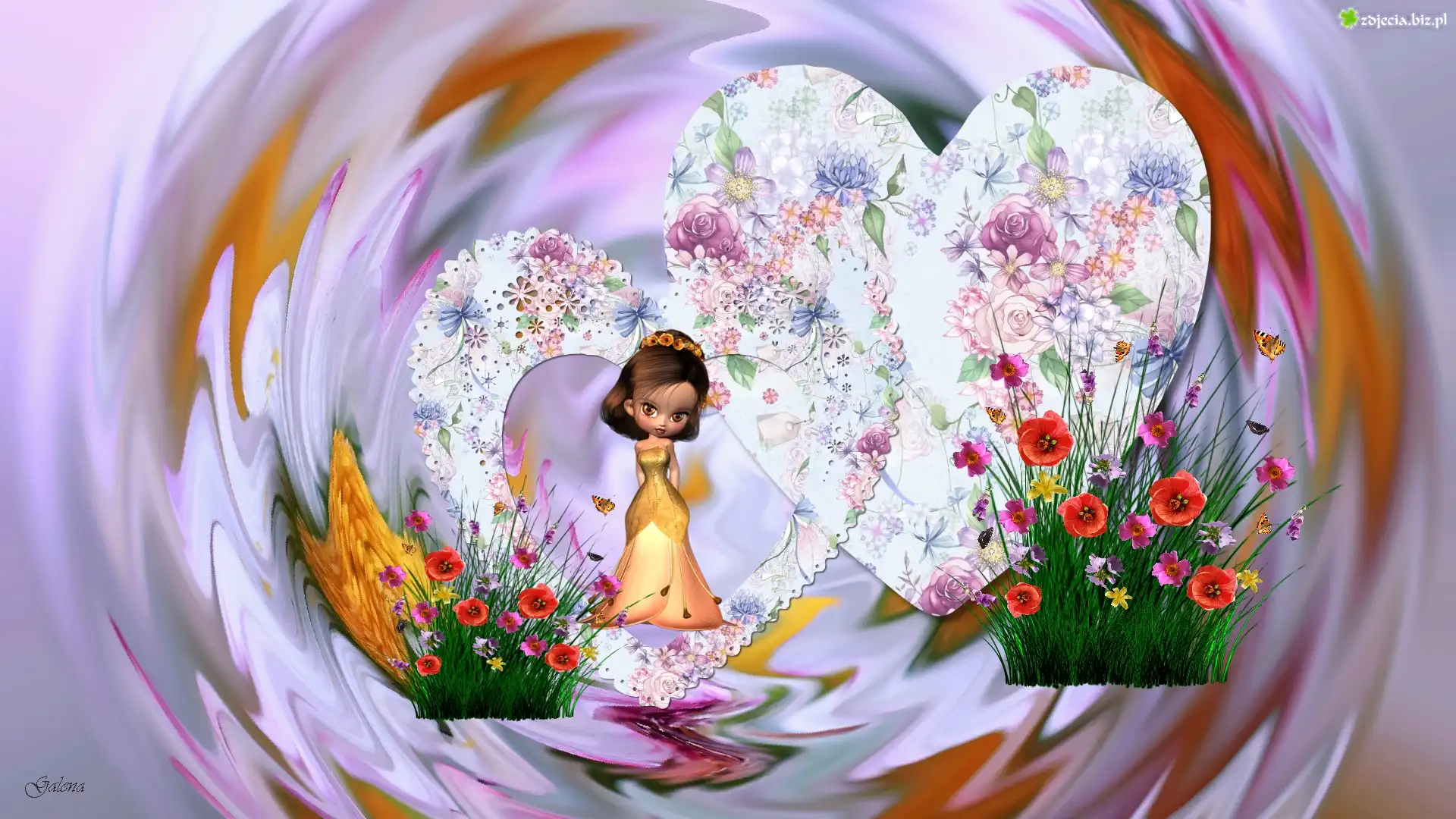 Zdjęcie Pastelowe, Serca, Kwiaty, Laleczka, Grafika