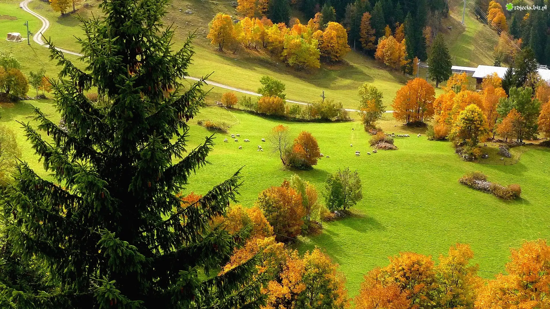 Zdjęcie Pola, Pastwisko, Łąka, Jesień, Owce, Z lotu ptaka