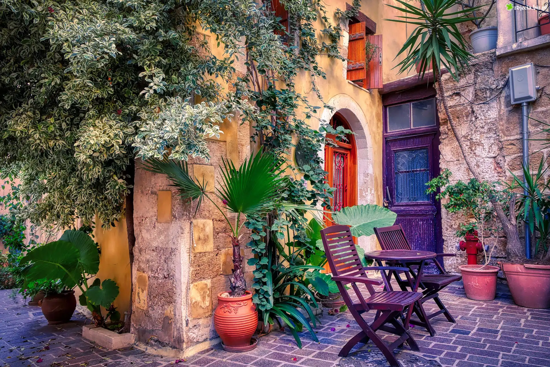 Zdjęcie, Dom, Patio, Stół, Krzesła, Donice, Palmy, Rośliny
