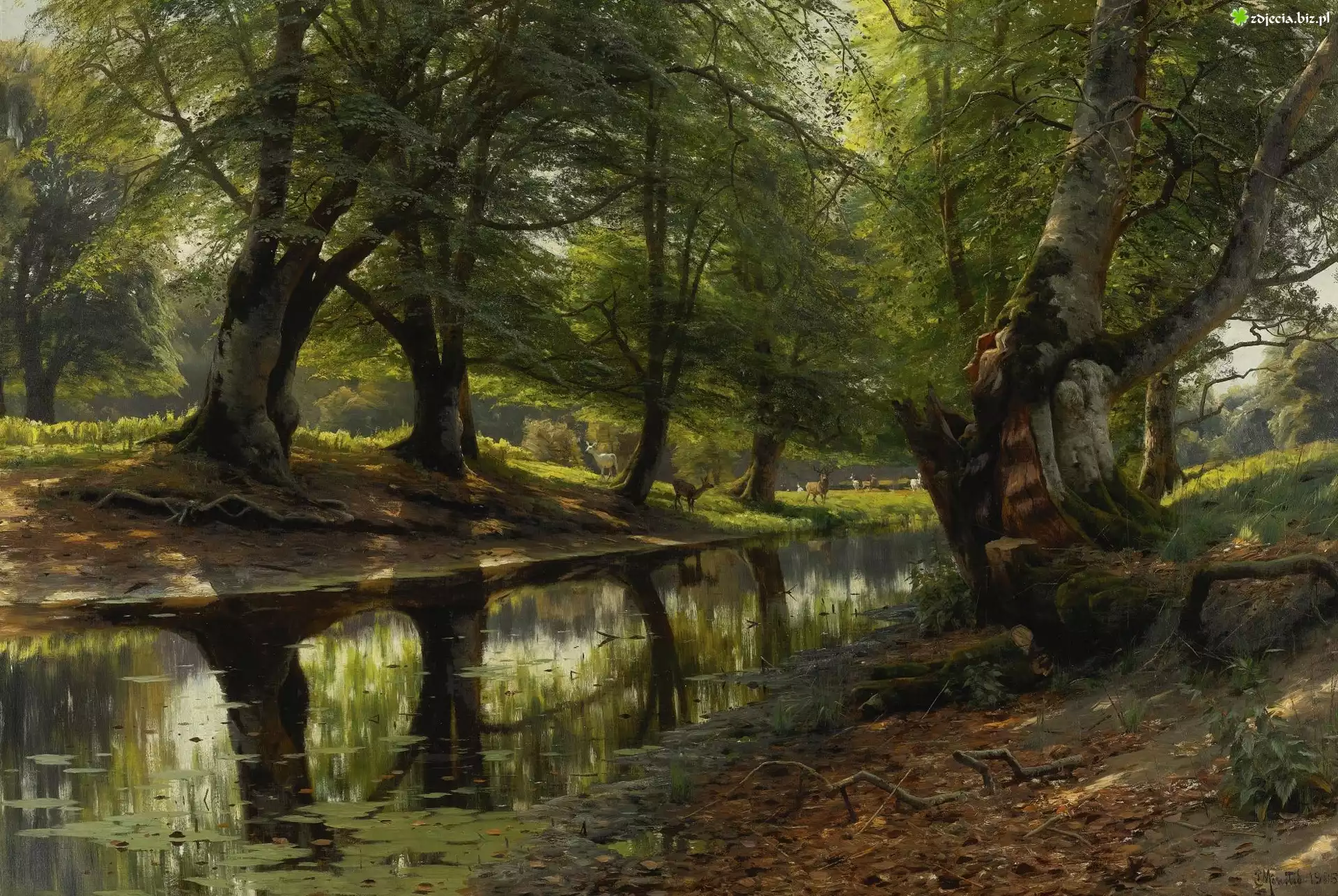 Zdjęcie Malarstwo, Peder Monsted, Drzewa, Koryto, Rzeka, Jelenie, Sarny