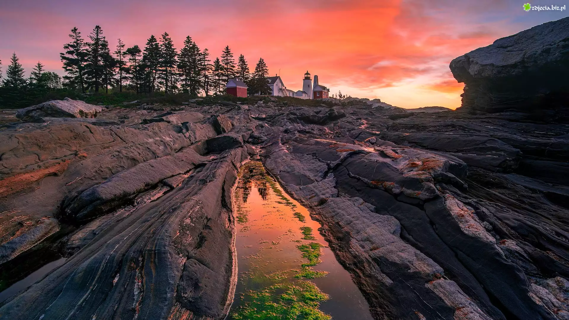 Zdjęcie Skały, Latarnia morska, Pemaquid Point Lighthouse, Drzewa, Zachód słońca, Stan Maine, Stany Zjednoczone |