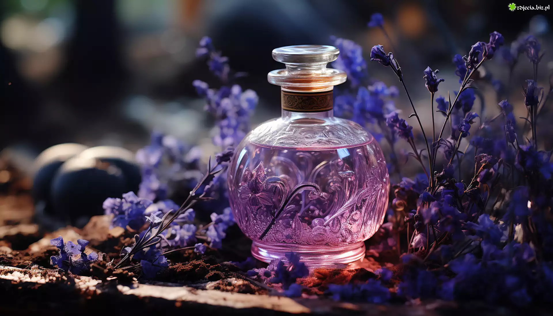 Zdjęcie Flakon, Perfumy, Fioletowe, Kwiaty, Lawenda