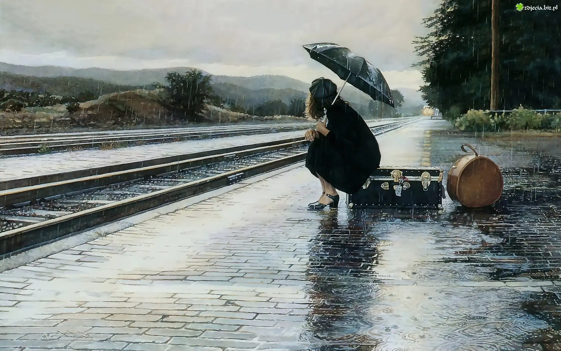 Zdjęcie Peron, Dziewczyna, Bagaże, Walizka, Deszcz, Parasol