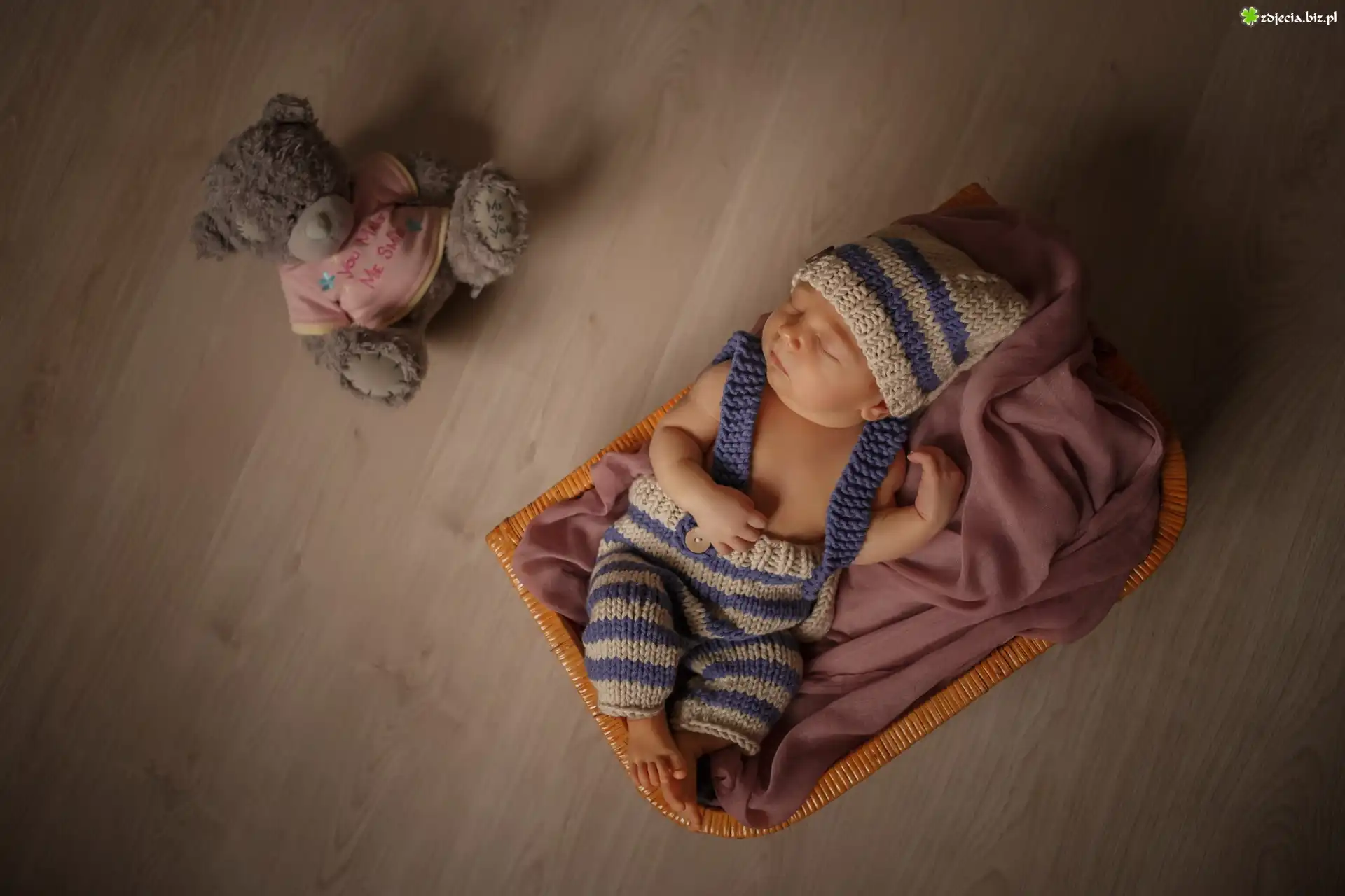 Zdjęcie Dziecko, Śpiące, Niemowlę, Czapeczka, Spodenki, Koszyk, Pluszowy, Miś