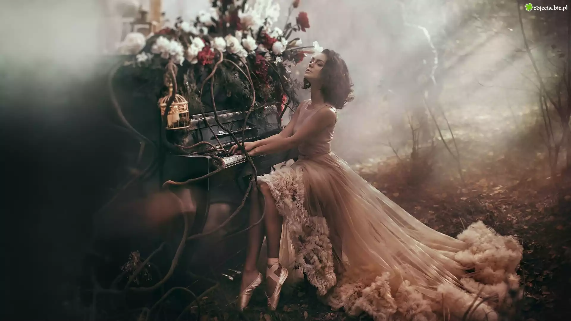 Zdjęcie, Kobieta, Pianino, kwiaty