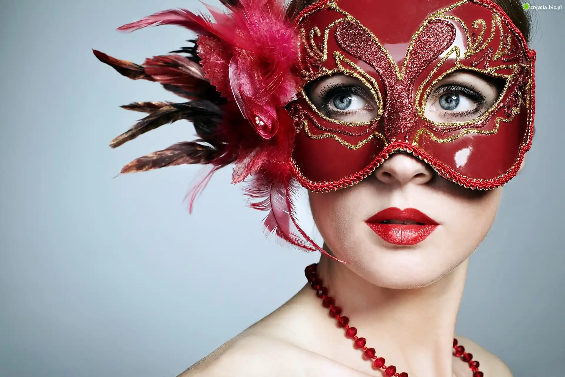 Zdjęcie Piękna, Kobieta, Twarz, Maska, Korale, Zbliżenie