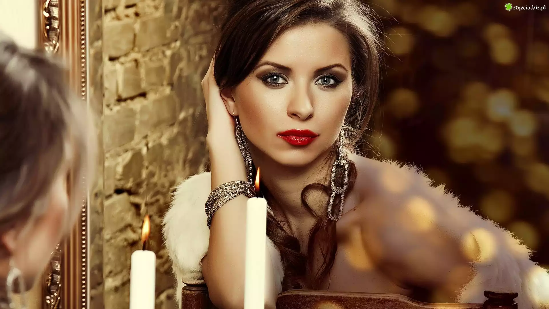 Zdjęcie, Kobieta, Szatynka, Makijaż, Biżuteria, Świece, Lustro