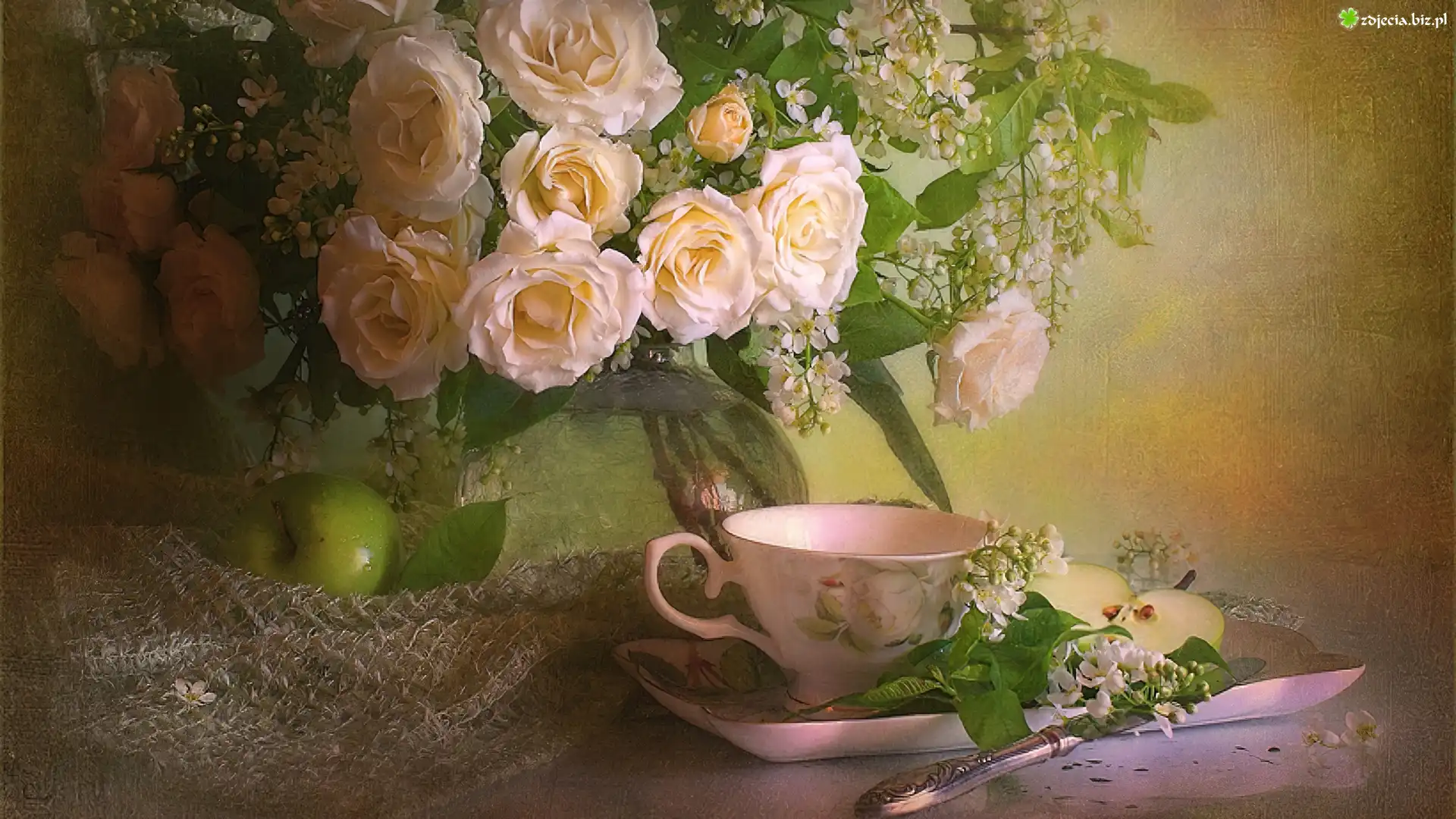 Zdjęcie Bukiet, Pięknych, Róż, Filiżanka, Jabłka, Koronkowa, Serwetka