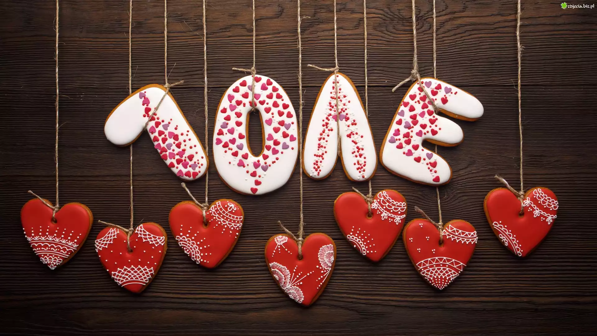 Zdjęcie Pierniczki, Serca, Napis, Love, Sznurek, Deski