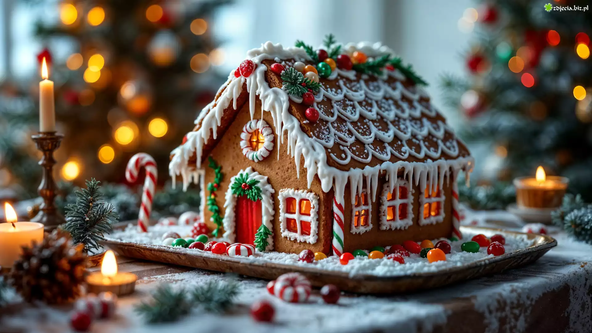 Zdjęcie Boże Narodzenie, Domek, Piernik, Świece, Lukier, Gałązki