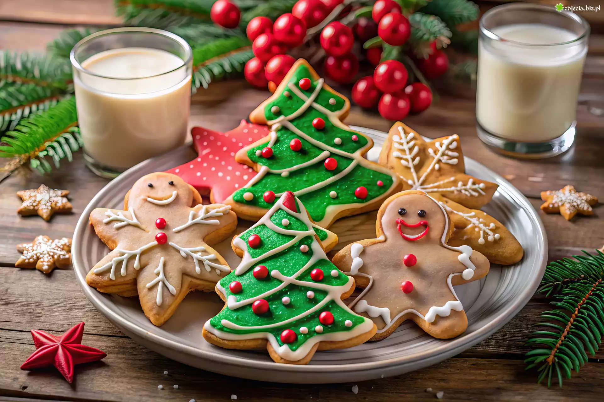 Zdjęcie Świąteczne, Ciastka, Lukrowane, Pierniki, Talerz, Szklanki, Mleko
