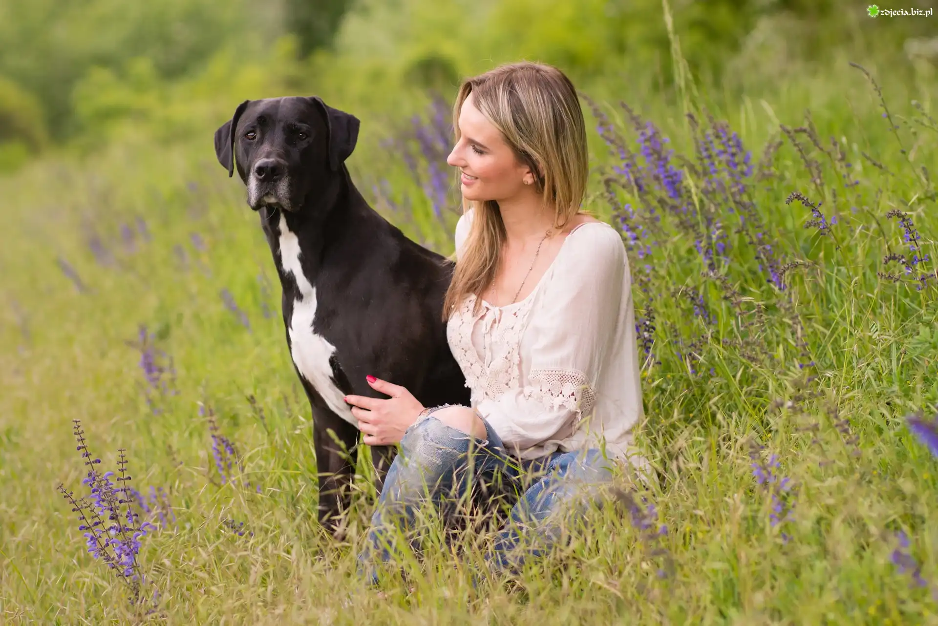 Zdjęcie Pies, Kobieta, Łąka, Kwiaty